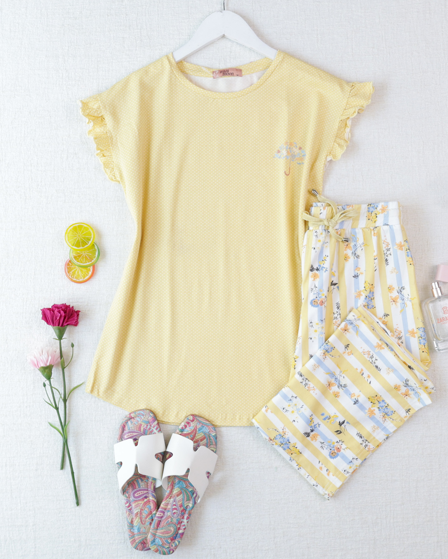 بجامة صيفية مريحة وأنيقة ، مصممة بخامة قطنية ناعمة وخفيفة لتمنحك راحة وانتعاش في البيت. تتميز بقصة عملية وألوان جذابة تضيف لمسة أنثوية لإطلالتك المنزلية.