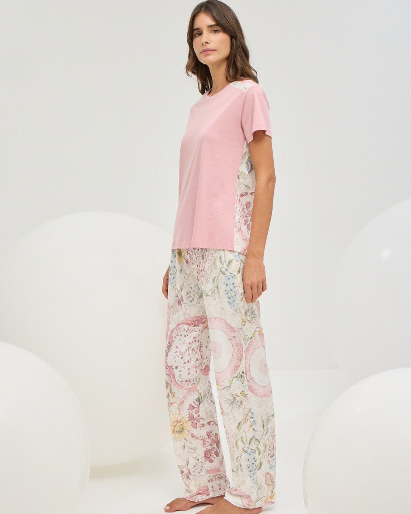 تضم توب بأكمام قصيرة باللون الوردي مزين بتفاصيل دانتيل وزهور مطرزة على الأكتاف، بالإضافة إلى بنطال طويل باللون الأبيض مزخرف برسومات وأشكال دائرية وزخارف نباتية باللون الوردي وألوان ناعمة أخرى، مع خصر مطاطي لارتداء مريح.