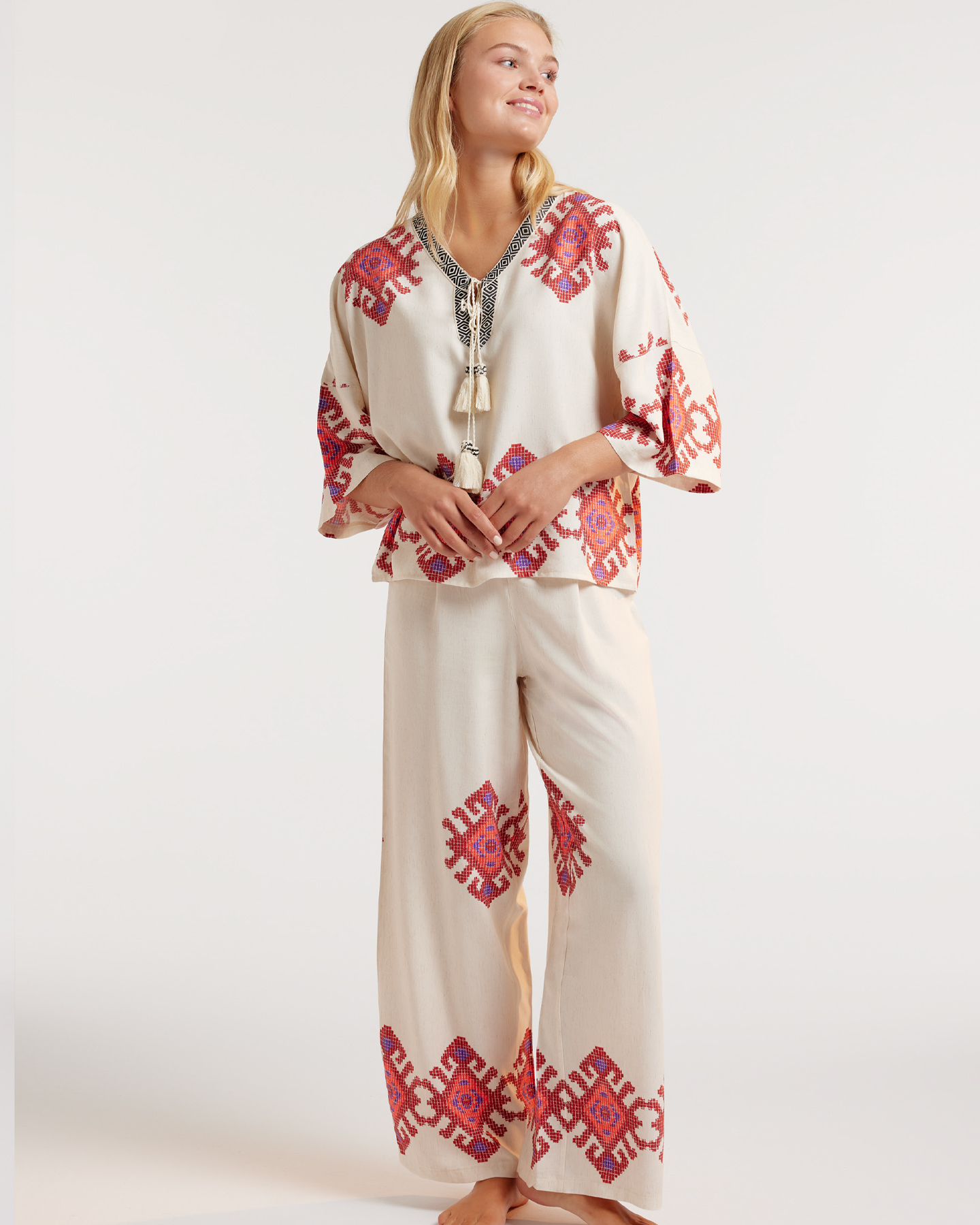 يضم توب واسع بأكمام طويلة باللون الأبيض مزين بتطريز هندسي باللونين الأحمر والأرجواني مع لمسات سوداء على الياقة، وحبل مزخرف ينتهي بكرات شرابة لإغلاق أنيق. يأتي معه بنطال طويل بنفس اللون والتطريز، مزود بحزام خصر مطاطي لراحة أكبر.