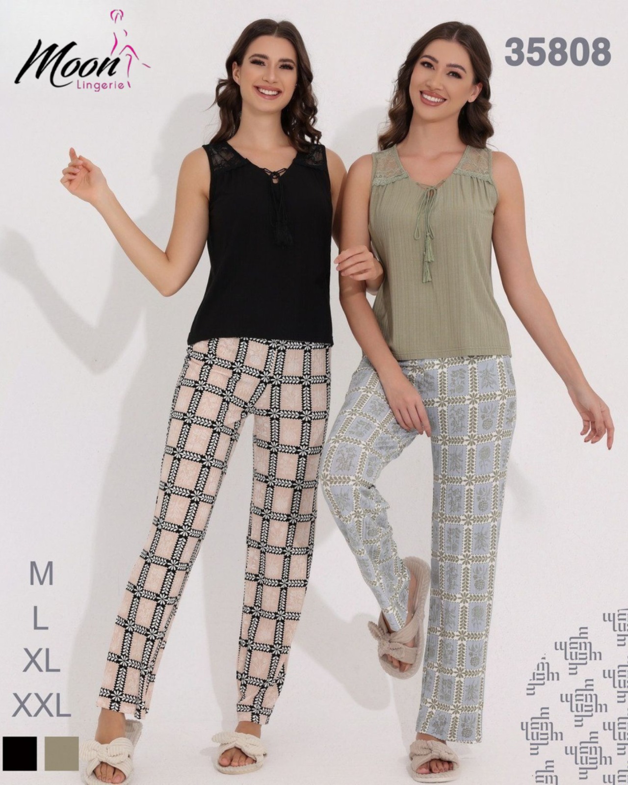 طقم بيت أنيق ومريح بلمسة أنثوية ناعمة، مكون من بلوزة بلا أكمام مع تفاصيل دانتيل عالأكتاف وحبل ربط ناعم، مرفق مع بنطلون طويل واسع بنقشات هندسية عصرية.